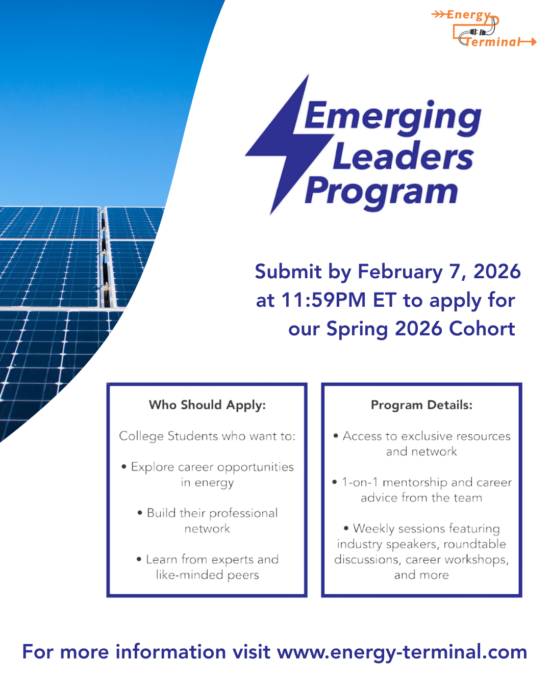 Energy Terminal’s Emerging Leaders Program is designed to help college students (undergraduate and graduate) fast-track their career growth in energy. The 9-week program will include weekly sessions with experts from the world's top companies across renewables, engineering, finance, venture capital, consulting, policy, and more.